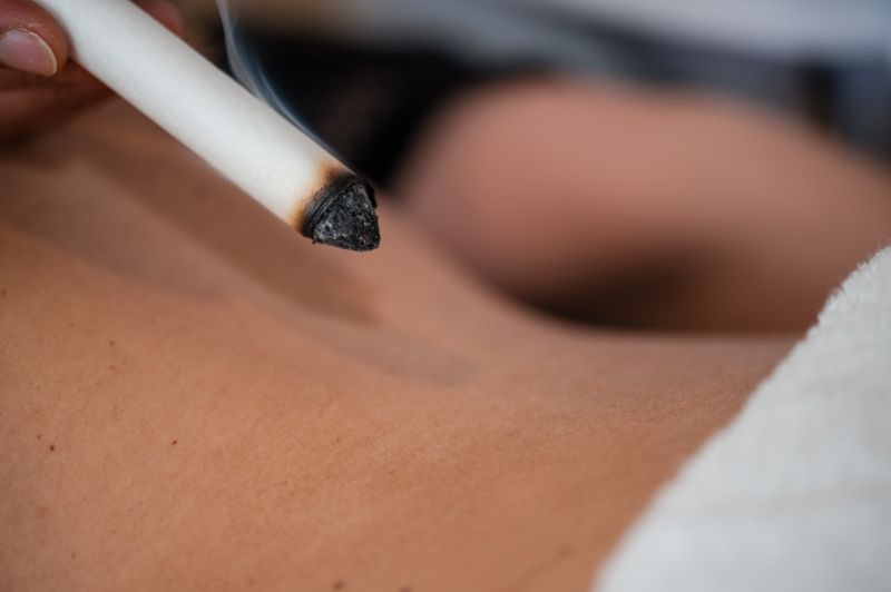 Le principe : chauffer des points d’acupuncture ou des zones spécifiques du corps en faisant brûler de l’armoise (moxa), une herbe séchée, à distance de la peau. Souvent couplé à l’acupuncture.